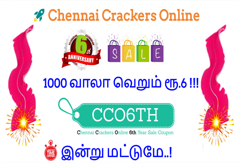 உங்கள் சென்னை கிராக்கர்ஸ் ஆன்லைன் (Chennai Crackers Online) தனது ஆறாவது ஆண்டை முன்னிட்டு 1000 வாலா வெறும் 6 ரூபாய்க்கு.. இந்த ஆஃபர் இன்று ஆர்டர் செய்யும் முதல் 1000 பேருக்கு மட்டுமே! Coupon Code : CCO6TH