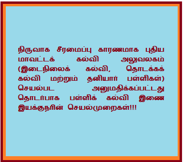 நிருவாக சீரமைப்பு காரணமாக புதிய மாவட்டக் கல்வி அலுவலகம் (இடைநிலைக் கல்வி, தொடக்கக் கல்வி மற்றும் தனியார் பள்ளிகள்) செயல்பட அனுமதிக்கப்பட்டது தொடர்பாக பள்ளிக் கல்வி இணை இயக்குநரின் செயல்முறைகள்!!!